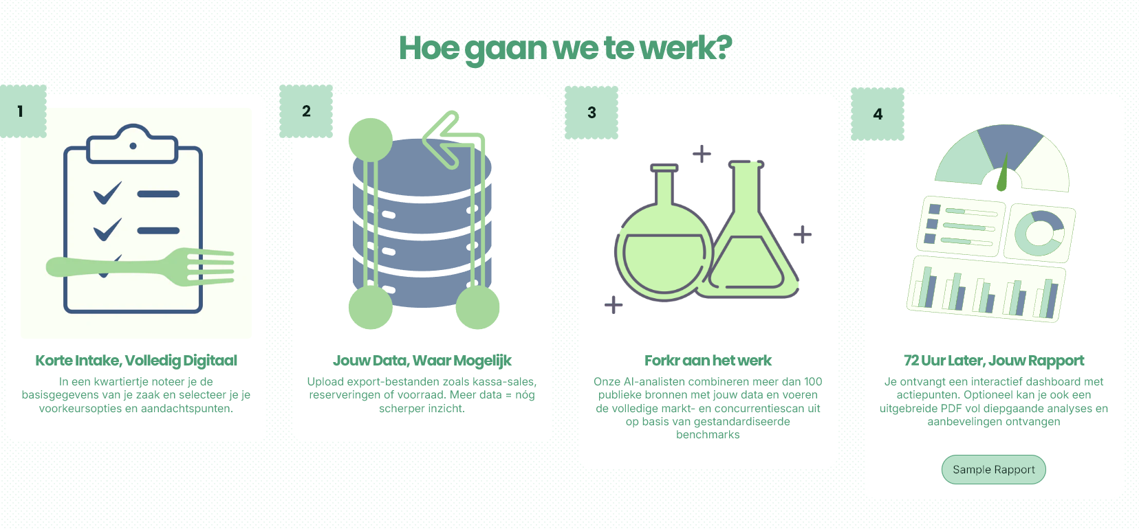 FORKR kwam bij ons met een duidelijk doel: horecazaken helpen om betere strategische beslissingen te nemen via slimme concurrentieanalyse en marktinzichten. Het idee stond scherp, maar de digitale uitwerking moest nog helemaal vorm krijgen. Wij begeleidden hen bij het bouwen van de eerste fundamenten.
